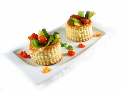 Lavamos la verdura y cortamos en tiras gruesas los pimientos y el zucchini. Untamos ligeramente las verduras con un pincel mojado en aceite de oliva y las vamos colocando en la sartén bien caliente. Picamos finamente los dientes de ajo y espolvoreamos por encima cuando la verdura esté casi asada. Ponemos a punto de sal. Rellenamos los hojaldres y servimos al instante. Podemos introducir los hojaldres rellenos al horno para presentar todo a la misma temperatura